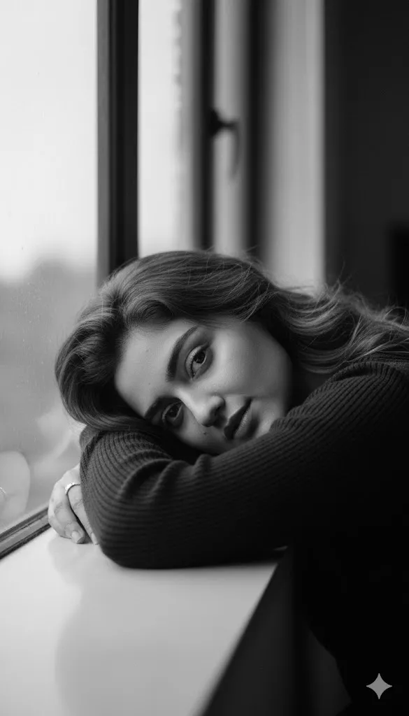 Overall mood is intimate, quiet, emotional, minimalist, and timeless, resembling a fine-art black-and-white portrait captured in a private moment.