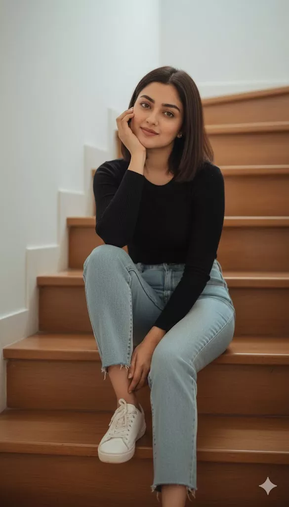 A highly detailed, photorealistic casual lifestyle portrait of the uploaded female subject sitting on a wooden indoor staircase. The subject is positioned centrally on the steps, seated in a relaxed pose with one knee raised and the other leg extended slightly forward. Her head is gently tilted to the side, resting on one hand, creating a soft, friendly, and approachable expression. She is wearing a fitted black long-sleeve top paired with light blue, high-waisted straight-leg jeans featuring slightly frayed hems. On her feet are clean white low-top sneakers, adding to the casual, everyday aesthetic. The outfit is minimal, modern, and youthful, with no heavy accessories or distractions. Her facial expression is warm and subtle, with a gentle smile and calm eye contact directed toward the camera. The mood feels natural and candid rather than posed. Her hair is straight, dark, and cut to shoulder length, styled neatly with a natural finish. Makeup is minimal and realistic, maintaining natural skin texture and soft tones. The environment is a modern interior staircase made of rich brown wooden steps with smooth white walls on both sides. The staircase curves slightly upward in the background, adding depth and clean architectural flow to the composition. The setting feels quiet, intimate, and contemporary. Lighting is soft, warm indoor ambient light, evenly illuminating the subject without harsh shadows. The light highlights facial features, skin tones, and fabric textures while keeping the overall scene balanced and cozy. Shadows are gentle and natural, contributing to a calm, welcoming atmosphere. The image is captured in a professional lifestyle photography style using a high-resolution camera. Shot at eye level with a medium focal length and moderate depth of field, keeping the subject sharply in focus while softly separating her from the background. Colors are warm, natural, and slightly muted, with a clean, modern aesthetic. The overall mood is relaxed, minimal, youthful, and authentic.