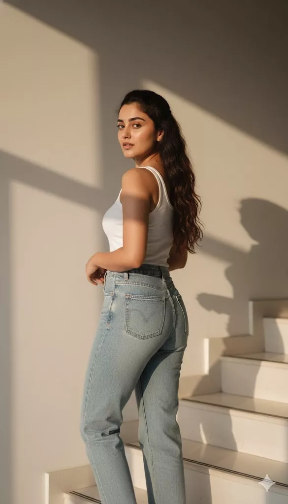 A highly detailed, photorealistic lifestyle portrait of the uploaded female subject standing on an indoor staircase during golden hour. The subject is positioned halfway up the stairs, captured from behind in a three-quarter rear angle, with her upper body slightly twisted as she looks back over her shoulder toward the camera. This pose creates a natural, candid, and softly confident mood. She is wearing a fitted white sleeveless tank top paired with high-waisted, light blue straight-leg denim jeans. The outfit is minimal, casual, and timeless, emphasizing clean lines and everyday fashion. No visible accessories dominate the frame, keeping the focus on posture, fabric texture, and natural form. Her facial expression is calm and neutral, with soft eye contact directed toward the camera. The expression feels unforced and intimate rather than posed. Her hair is long, dark, and naturally wavy, falling freely down her back with light movement. Makeup is minimal and realistic, preserving natural skin texture, subtle highlights, and a clean complexion. The environment is a modern, minimal interior staircase with white walls and clean architectural lines. Strong sunlight enters from the side, casting sharp, elongated shadows of the subject and stair railing onto the wall. The shadow plays an important compositional role, adding depth, geometry, and visual interest to the scene. Lighting is warm, directional golden-hour sunlight, creating high contrast between illuminated areas and soft shadows. The light emphasizes the contours of the subject’s silhouette, hair texture, and denim fabric while maintaining a soft, natural look. Highlights are warm and slightly diffused, with gentle falloff into shadow. The image is captured in a professional, editorial lifestyle photography style using a high-resolution camera. Shot at eye-level to slightly lower than eye-level, with a medium focal length and shallow to moderate depth of field. Colors are warm, muted, and natural, with subtle film grain and a cinematic, sunlit aesthetic. The overall mood is modern, minimal, intimate, and effortlessly stylish.