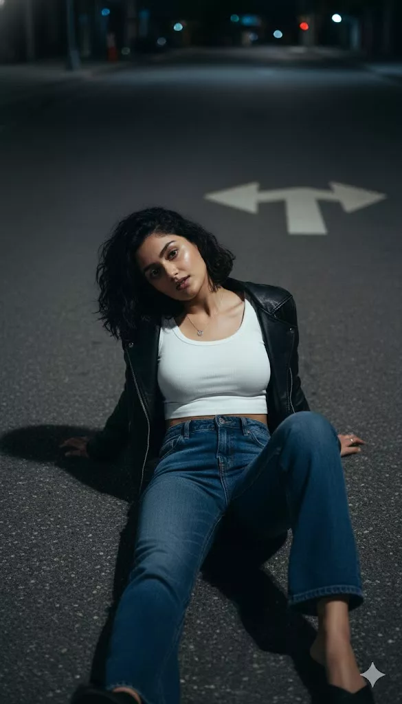 A highly detailed, photorealistic urban night portrait of the uploaded female subject sitting directly on an empty asphalt road at night. The subject is positioned slightly reclined, with one knee bent and the other leg extended forward, creating a casual yet gritty street-style pose. Her upper body leans subtly to one side, with her head tilted and resting lightly against her shoulder, conveying a relaxed but introspective mood. She is wearing a fitted white cropped tank top that reveals the midriff, paired with loose, dark-wash, wide-leg denim jeans. A black leather jacket is worn loosely off the shoulders, adding an effortless, edgy street-fashion aesthetic. A simple pendant necklace rests at the center of her chest, providing a minimal accent without distracting from the overall look. Her facial expression is calm, slightly serious, and contemplative, with soft eye contact directed toward the camera. Lips are relaxed and closed, and the gaze feels natural rather than posed. Her hair is short to medium length, dark, naturally curly, and slightly tousled, enhancing the raw, unpolished feel of the scene. Makeup is minimal and realistic, with natural skin texture, soft highlights, and subtle eye definition. The environment is an empty roadway at night, with large white directional arrow markings clearly visible on the asphalt behind and beneath the subject. The setting feels quiet, urban, and cinematic, with no visible vehicles or pedestrians. The background remains dark and uncluttered, emphasizing isolation and mood. Lighting is low-key and cinematic, using a cool-toned artificial light source that creates strong contrast between highlights and shadows. Light falls primarily on the subject’s face and torso, while the surrounding road fades into darkness. Shadows are soft but directional, enhancing depth and texture in the asphalt and clothing. Captured with a professional camera in a high-resolution, editorial street-photography style. Shot from a slightly elevated angle looking down toward the subject, using a medium focal length, shallow depth of field, natural film-like grain, realistic color grading, and cool, muted tones. The overall aesthetic is moody, modern, urban fashion photography with a cinematic, late-night atmosphere.