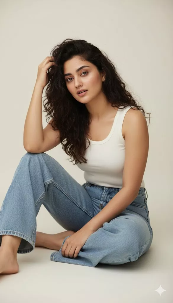 A highly detailed, photorealistic studio portrait of the uploaded female subject sitting on the floor against a clean, neutral studio background. The subject is seated with knees bent and legs angled slightly to one side, barefoot, creating a relaxed yet intimate pose. One arm rests casually across her legs while the other hand is raised to her hair, fingers gently touching the side of her head, adding a natural, contemplative gesture. Her facial expression is calm, soft, and introspective, with slightly parted lips and a steady gaze directed toward the camera. The mood feels quiet, elegant, and emotionally subtle rather than posed or exaggerated. She is wearing light-wash, loose-fit denim jeans with a relaxed silhouette, paired with a minimal, light-toned sleeveless or strap-style top that keeps the styling understated and modern. No footwear is present, emphasizing a raw, natural aesthetic. Jewelry is minimal or absent, keeping the focus on form, posture, and expression. Her hair is long, dark, and worn loose with natural volume, flowing over her shoulders. Makeup is minimal and clean, featuring even skin tone, softly defined eyes, and natural lips, with realistic skin texture clearly visible. The lighting is soft and diffused studio lighting, evenly illuminating the subject while gently shaping facial features and body contours. Shadows are subtle and controlled, contributing to a clean editorial look. The background is plain and uncluttered, ensuring full attention remains on the subject. Captured with a professional camera in a high-resolution, editorial portrait style, using a medium focal length, eye-level angle, shallow depth of field, natural color grading, and realistic tones. The overall aesthetic is minimalist, modern fashion editorial photography with a calm, intimate mood.