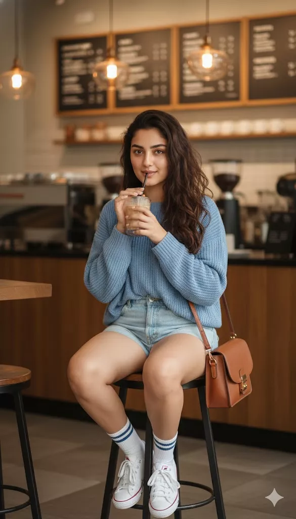 A highly detailed, photorealistic lifestyle portrait of the uploaded female subject sitting on a wooden bar stool inside a modern, cozy coffee shop. The subject is positioned facing the camera at a slight angle, seated casually with both legs relaxed and slightly forward. She holds a transparent glass of iced coffee with a straw near her lips, creating a natural, candid moment. Her facial expression is soft and calm with a subtle, friendly smile, and her gaze is directed toward the camera. She is wearing an oversized knitted sweater in muted blue, paired with light-wash denim shorts. On her feet are white low-top sneakers with red accents, worn with white crew socks featuring blue stripes. A brown leather shoulder bag hangs naturally from her shoulder, resting against her side, adding a casual, everyday aesthetic. Her hair is long, dark, and worn loose with a natural wave, parted slightly to one side. Makeup is minimal and natural, with even skin tone, softly defined eyes, and neutral lips. No heavy jewelry or accessories are visible, keeping the look relaxed and realistic. The environment is a warm, modern café interior with a wooden counter, coffee equipment, and menu boards visible in the softly blurred background. Overhead pendant lights cast warm ambient lighting, creating a cozy atmosphere. The background is shallow depth of field, ensuring the subject remains the clear focal point. The image is captured using a professional camera with a lifestyle photography approach, medium focal length, eye-level perspective, soft natural lighting mixed with warm indoor tones, high resolution, realistic skin texture, and natural color balance. The overall style is candid, editorial lifestyle photography with a clean, authentic, everyday mood.