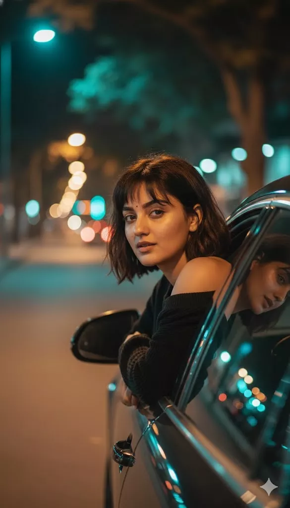 A photorealistic nighttime cinematic portrait of the uploaded female subject leaning out of a car window on a quiet urban street. The subject is positioned sideways, resting her arms casually on the car door frame, upper body slightly leaning outward. She is wearing an off-shoulder black knit sweater that exposes one shoulder naturally, creating a relaxed yet sensual look. The fabric appears soft and slightly oversized. No visible accessories or heavy jewelry are present, keeping the styling minimal. Her hair is short, dark, and cut into a soft bob with natural texture and light fringe bangs. Hair appears slightly tousled by the night air. Makeup is minimal and natural, with smooth skin tones and soft lips. Her expression is calm, introspective, and confident, with eyes looking slightly to the side rather than directly at the camera. The scene takes place at night on a city street. Streetlights and distant traffic lights create colorful bokeh in the background, with teal, orange, and warm yellow tones. The road markings and tree-lined street are faintly visible but blurred due to shallow depth of field. Lighting is cinematic and low-light, with soft highlights on the face and shoulders coming from street lighting and ambient city glow. Shadows are gentle, preserving facial detail while maintaining a moody atmosphere. Camera angle is close, slightly below eye level, emphasizing intimacy and realism. The car exterior reflects city lights subtly, adding depth and realism to the frame. Depth of field is shallow, with sharp focus on the subject and smooth background blur. Overall mood is moody, urban, cinematic, and late-night aesthetic, resembling a candid lifestyle photograph captured during a quiet city drive.