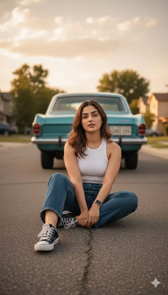 A photorealistic outdoor lifestyle portrait of the uploaded female subject sitting on an asphalt road in a quiet residential street. The subject is seated on the ground with legs bent and spread casually, hands clasped loosely in front, body slightly leaning forward. She is wearing a white sleeveless tank top, relaxed-fit blue denim jeans, and black low-top canvas sneakers with white laces and white rubber soles. A digital wristwatch is worn on her left wrist. Clothing appears casual, everyday streetwear with a slightly vintage feel. Her hair is long, brown, and worn loose with a natural, slightly wavy texture, parted near the center. Makeup is minimal and natural, with soft skin tones and neutral lips. Facial expression is calm, relaxed, and slightly introspective, with eyes looking directly at the camera. Behind her is a vintage turquoise-blue car parked on the street. The rear portion of the car is visible, including a rectangular license plate mounted at the back. The car’s paint has a matte, slightly worn appearance, adding a retro aesthetic. The environment is an outdoor suburban street with soft natural daylight. Background elements include blurred houses, trees, and warm-toned surroundings, indicating late afternoon or early evening lighting. The background is shallow-focused, keeping attention on the subject while maintaining environmental context. The camera angle is low and front-facing, close to ground level, creating an intimate and casual perspective. The image has a shallow depth of field with cinematic color grading, warm highlights, and muted shadows, giving the photo a nostalgic, film-like lifestyle aesthetic. Overall mood is relaxed, youthful, candid, and slightly vintage, resembling a natural street portrait captured during golden hour.