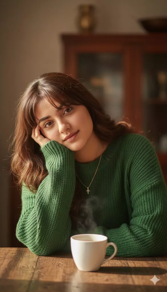 A photorealistic indoor close-up portrait of the uploaded female subject sitting at a table in a warm, softly lit room. The subject is positioned facing the camera, resting her head gently on one hand with her elbow placed on the table. She is wearing a thick, textured green knit sweater with long sleeves that partially cover her hand. The fabric appears soft and slightly loose, suitable for a cozy indoor setting. Around her neck, she wears a delicate necklace with a small cross-shaped pendant. Her hair is medium to long length, brown in color, worn loose with natural volume and soft bangs framing her forehead. Makeup is subtle and natural, with even skin tone, soft blush, and neutral lip color. Facial expression is calm, slightly pensive, and relaxed, with eyes looking directly toward the camera. A white ceramic cup filled with a hot beverage is placed on the table in the foreground. Light steam is visible rising from the cup, indicating warmth. The lighting is warm natural sunlight entering from one side, creating soft highlights on the subject’s face and gentle shadows. The background is softly blurred, showing an indoor environment with warm tones, likely a home or café-like space. The image is shot at eye level with shallow depth of field, emphasizing the subject’s face while keeping the background minimal and unobtrusive. The overall mood is intimate, cozy, calm, and contemplative, resembling a natural lifestyle portrait captured in quiet indoor light.