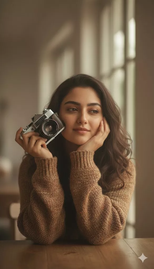 A highly detailed, photorealistic indoor portrait of the uploaded female subject holding a vintage film camera close to her face. The subject is seated at a table, resting her face gently in both hands, with the camera held softly against the left side of her cheek, creating an intimate and contemplative composition. She is wearing a cozy knitted sweater with warm earthy tones, primarily brown with subtle muted color variations on the sleeves. The fabric texture is clearly visible, soft, and natural, contributing to a calm, nostalgic aesthetic. Her facial expression is thoughtful and slightly introspective, with relaxed lips and eyes looking gently off-camera. Makeup is minimal and natural, preserving realistic skin texture and soft highlights. Her hair is long, dark, and loose, styled naturally with slight waves framing her face. The camera is a classic vintage film camera with visible metal and leather detailing, held in a natural, casual manner. No exaggerated branding emphasis, just realistic object presence. The setting is a softly lit indoor room with a blurred background. Large windows are visible behind her, diffusing natural light into the space. The background remains out of focus, maintaining attention on the subject while providing depth and realism. Lighting is warm, soft, and diffused, likely natural window light combined with subtle ambient indoor lighting. Shadows are gentle and smooth, with no harsh contrast. The color palette is warm and muted, giving a nostalgic, analog-film mood. The image is captured in a lifestyle portrait photography style. Shot at eye level with a shallow depth of field, keeping the subject sharply in focus while the background fades softly. The overall mood is calm, intimate, cozy, and reflective, resembling classic film photography aesthetics.