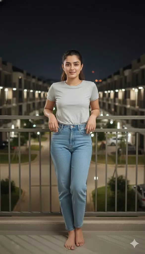 A highly detailed, photorealistic nighttime balcony portrait of the uploaded female subject standing casually on a residential apartment balcony. The subject is positioned facing the camera with a relaxed posture, both hands resting lightly on the metal railing on either side, creating a calm, confident, and natural stance. She is wearing a simple light-grey short-sleeve T-shirt tucked into high-waisted light blue straight-leg denim jeans. She is barefoot, adding a relaxed, at-home lifestyle feel to the image. Clothing is minimal, clean, and everyday casual with no heavy accessories, maintaining a natural and authentic appearance. Her facial expression is soft and friendly with a gentle smile and direct eye contact toward the camera. Makeup is minimal and natural, preserving realistic skin texture. Her hair is medium length, tied back in a neat high ponytail, keeping the look clean and casual. The setting is a modern residential neighborhood at night, visible in the background with rows of townhouses or apartments illuminated by warm interior lights. Trees, walkways, and street lighting are visible below, adding depth and urban residential context. The sky is dark, indicating nighttime, with no visible stars, contributing to a calm evening atmosphere. Lighting is soft ambient nighttime lighting combined with warm artificial lights from surrounding buildings. The subject is evenly lit with no harsh shadows, maintaining a balanced exposure between the subject and background. Shadows are subtle and realistic. The image is captured in a high-resolution lifestyle photography style. Shot at eye level with a medium focal length and moderate depth of field, keeping the subject sharp while the background remains softly detailed. Colors are natural and slightly cool, with a calm, cozy nighttime aesthetic. The overall mood is peaceful, casual, and authentic.
