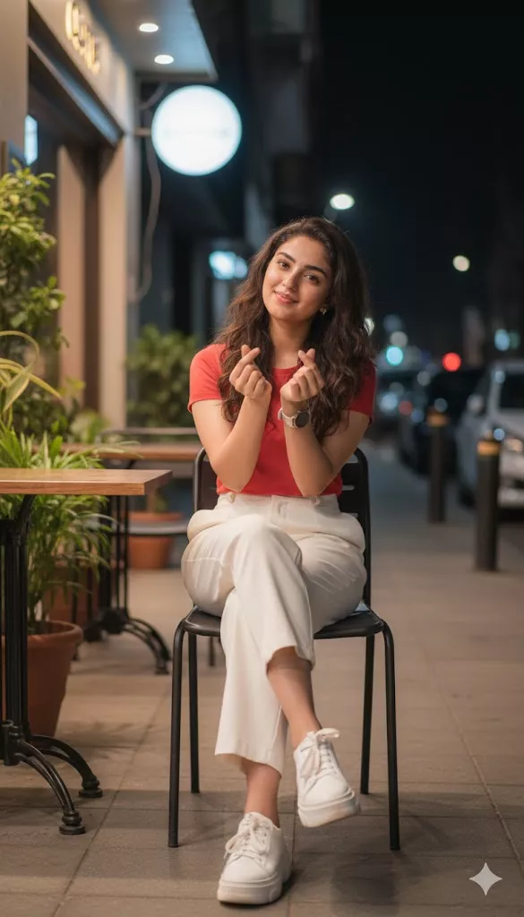A highly detailed, photorealistic outdoor nighttime lifestyle portrait of the uploaded female subject sitting on a metal café chair on a quiet urban sidewalk. The subject is seated in a relaxed, casual pose with one leg crossed over the other, leaning back slightly, and holding both hands up making small finger-heart gestures toward the camera, creating a friendly, playful, and approachable mood. She is wearing a plain red short-sleeve T-shirt paired with off-white or beige straight-fit ankle-length pants. On her feet are chunky white sneakers with thick soles, contributing to a modern, casual street-style aesthetic. Accessories are minimal, including a wristwatch, keeping the look clean and everyday realistic. Her facial expression is warm and cheerful with a soft smile and direct eye contact toward the camera. Makeup is natural and subtle, preserving realistic skin texture and a fresh appearance. Her hair is dark brown, medium length, worn loose with a neat, natural style. The setting is an outdoor café environment at night, with small wooden tables and chairs placed along a sidewalk. Behind her is a softly lit café storefront with visible signage and warm interior lighting. Green plants and small trees line the seating area, while a calm street with parked cars and streetlights extends into the background, adding depth and urban context. Lighting is ambient nighttime lighting combined with warm artificial lights from the café and street lamps. The light softly illuminates the subject’s face and outfit without harsh shadows, creating a cozy, relaxed evening atmosphere. Shadows are natural and diffused. The image is captured in a realistic lifestyle photography style using a high-resolution camera. Shot at eye level with a medium focal length and moderate depth of field, keeping the subject in sharp focus while softly blurring the background. Colors are warm, natural, and balanced, with a calm urban night aesthetic. The overall mood is casual, friendly, youthful, and authentic.