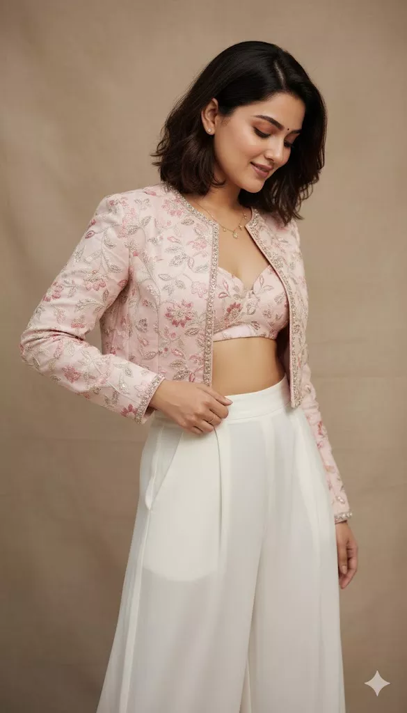 A highly detailed, photorealistic fashion portrait of the uploaded female subject, captured from mid-thigh upward in a relaxed standing pose. The subject is facing slightly to the side, with her head tilted downward and gaze directed toward the floor, creating a calm and introspective mood. Her posture is soft and natural, with one hand resting near her waist and the other relaxed by her side. She is wearing a light pastel outfit consisting of a structured, cropped jacket with delicate pink floral patterns and embellished trim along the edges. Underneath, she wears a matching light pink bralette with a subtle floral design. The lower half consists of high-waisted, loose-fitting white or off-white trousers with a soft, flowing fabric. The overall outfit creates a refined yet relaxed high-fashion aesthetic. Her hair is short to medium length, dark brown, styled in a natural, slightly tousled bob with a side part. Makeup is minimal and elegant, featuring an even complexion, softly defined eyes, natural brows, and muted lips. She is wearing a delicate necklace with small pendants and a ring, adding subtle jewelry details without overpowering the look. The background is a neutral, softly textured fabric backdrop in beige or cream tones, creating a clean and editorial studio environment. Lighting is soft, diffused, and evenly distributed, with gentle shadows that highlight facial features, fabric textures, and outfit details without harsh contrast. Captured using a professional studio setup with a full-frame DSLR or mirrorless camera, portrait focal length (approximately 50mm to 85mm), shallow to moderate depth of field, sharp focus on the subject, accurate color tones, and editorial fashion photography composition.