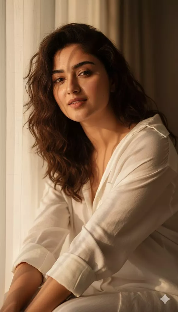 A highly detailed, photorealistic portrait of the uploaded female subject, seated indoors and framed from the waist up. The subject is facing the camera with a relaxed, intimate posture, her upper body leaning slightly forward. Her facial expression is soft, warm, and subtly inviting, with gently closed lips and a calm, direct gaze toward the camera. She is wearing a lightweight, semi-sheer white shirt with a loose fit, partially unbuttoned at the front. The fabric appears thin, textured, and softly wrinkled, allowing warm light to pass through. The shirt is casually styled, contributing to a natural, unposed look. No visible accessories, logos, or patterns are present. Her hair is medium length, dark brown, naturally wavy, and slightly messy, falling freely around her face and neck. Strands of hair catch the light, adding texture and depth. Makeup is minimal and natural, with warm skin tones, visible freckles or skin texture, soft blush, natural eyebrows, and muted lips. The environment is an indoor setting with sheer fabric or curtains in the background. Warm sunlight streams through the material, casting soft, diffused highlights and organic shadow patterns across the subject’s face, clothing, and surroundings. The background remains simple and softly blurred. Lighting is natural, warm, and directional, creating a golden-hour atmosphere with high contrast between highlights and shadows. Skin texture and fabric details are clearly visible, with no artificial color grading. Captured using a full-frame DSLR or mirrorless camera with a portrait lens (approximately 50mm to 85mm), shallow depth of field, sharp focus on the subject’s face, natural color tones, and professional editorial photography composition.