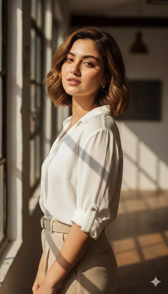A highly detailed, photorealistic portrait of the uploaded female subject, captured from the waist up in a three-quarter pose. The subject is standing indoors and slightly turning her upper body toward the camera, with her head gently tilted and her gaze directed forward. Her facial expression is calm, introspective, and neutral, with relaxed lips and soft eyes. She is wearing a lightweight, semi-sheer white blouse with a loose fit and rolled-up sleeves. The blouse is tucked into high-waisted beige or tan trousers, secured with a simple belt. No visible patterns or logos are present on the clothing, maintaining a minimalist and natural aesthetic. Her hair is short to medium length, light brown or blonde, styled in a soft, natural bob with subtle waves. The hair is slightly tousled and illuminated by sunlight. Makeup is minimal and natural, with even skin tone, subtle shadows under the eyes, natural eyebrows, and muted lips. The environment appears to be an industrial-style interior with large windows. Strong natural sunlight enters from the side, casting dramatic diagonal light and shadow patterns across the wall, floor, and the subject’s face and clothing. The background is softly blurred, showing structural elements like beams or window frames without sharp detail. Lighting is natural, warm, and directional, emphasizing skin texture and creating high contrast between highlights and shadows. The image has a soft, cinematic warmth without artificial color grading. Captured using a full-frame DSLR or mirrorless camera with a portrait lens (approximately 50mm), shallow to moderate depth of field, sharp focus on the subject, natural color tones, high dynamic range, and professional editorial photography composition.