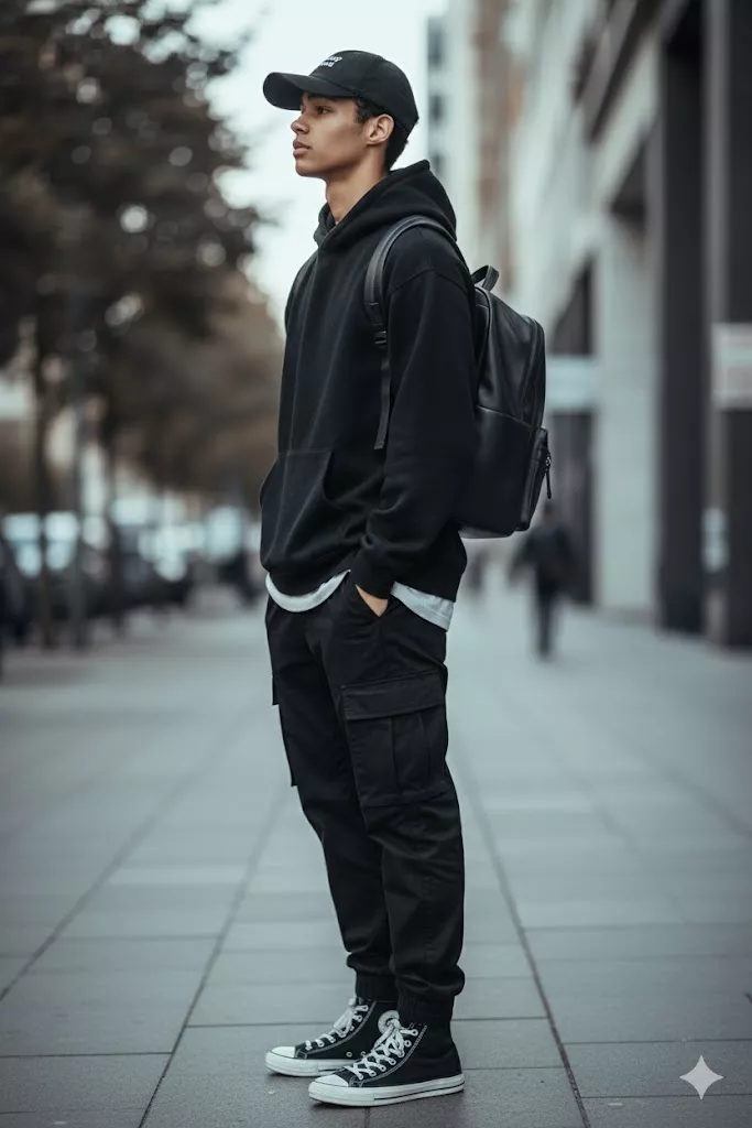 A highly detailed, photorealistic urban street-style portrait of the uploaded male subject, standing upright on a city sidewalk. His body is positioned in a clean side profile facing left, with a relaxed posture. Both hands are placed casually inside the trouser pockets. His head is slightly raised, and he is looking forward into the distance with a calm, composed, and confident expression. The subject is dressed in an all-black contemporary streetwear outfit. He is wearing a black oversized hoodie with a clean, minimal design and no visible logos, paired with black straight-cut cargo-style trousers featuring large utility pockets on the sides. The trousers are slightly cuffed at the ankles. On his feet, he is wearing classic black high-top canvas sneakers with white laces and white rubber soles. Accessories include a structured black leather backpack worn over both shoulders, adding a functional urban aesthetic. He is also wearing a black baseball cap with a minimal white logo centered on the front, worn forward. No visible jewelry or eyewear is present. Hair is mostly concealed under the cap, with short dark strands visible at the sides. Facial hair is clean-shaven. Skin texture appears natural and realistic, suitable for accurate face-swap alignment. The environment is a modern city street with softly blurred buildings and trees in the background. The street and sidewalk are visible, with subtle urban details such as road markings and concrete paving. The background is rendered with shallow depth of field, keeping the subject sharply in focus while maintaining a clean, cinematic urban backdrop. Lighting is natural daylight, soft and evenly diffused, creating gentle highlights on the face and clothing without harsh shadows. The overall color grading is neutral to slightly cool, emphasizing the monochrome black outfit and modern street-fashion tone. Captured using a professional full-frame DSLR or mirrorless camera with a portrait lens (approximately 50mm to 85mm), sharp subject focus, shallow depth of field, high clarity, controlled contrast, and editorial street-fashion photography composition optimized for precise and realistic face-swap results.