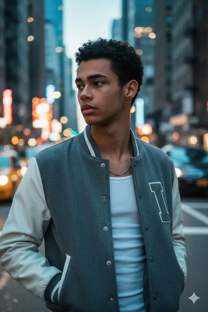 A highly detailed, photorealistic urban street fashion portrait of the uploaded male subject, captured mid-stance on a city street during early evening. His body is angled slightly to the right in a three-quarter profile, shoulders relaxed. Both hands are positioned near the waist, resting casually inside the jacket pockets. His head is turned sharply to the left, looking off-frame with a focused, alert, and confident expression, as if reacting to movement in the environment. The subject is dressed in a modern varsity-style jacket featuring a soft grey wool body with contrasting white sleeves. The jacket includes ribbed cuffs and hem with subtle stripe detailing, snap-button closure, and a minimal chest patch detail. Underneath, he wears a fitted white ribbed tank top, clean and logo-free, emphasizing a casual yet styled silhouette. The outfit follows a neutral, streetwear-inspired color palette. Accessories are minimal: a thin metallic chain necklace resting at the collarbone. No eyewear or additional accessories are visible. Hair is styled in a voluminous, textured modern cut with natural dark tones, slightly tousled for a candid street look. Facial hair is clean-shaven or very lightly stubbled, maintaining a youthful, sharp appearance. Skin texture appears natural with realistic detail. The environment is a busy urban downtown street with tall buildings, palm trees, traffic lights, and moving cars in the background. The background is rendered with strong bokeh, featuring colorful city lights and soft motion blur, creating depth and a cinematic atmosphere. Lighting is natural dusk lighting combined with ambient city illumination, producing soft highlights on the face and jacket while maintaining balanced shadows. The overall color grading is cinematic with slightly cool tones and vibrant background bokeh. Captured using a professional full-frame DSLR or mirrorless camera with a portrait lens (approximately 50mm to 85mm), sharp focus on the subject, shallow depth of field, high clarity, realistic contrast, and editorial street-photography composition optimized for accurate face-swap alignment and high photorealism.