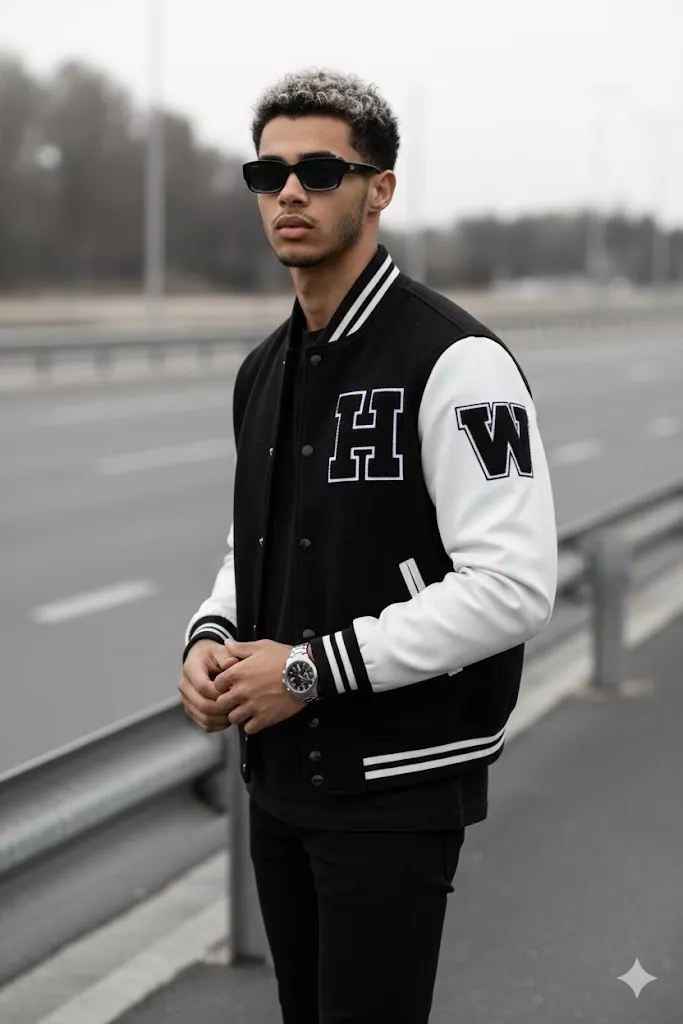 A highly detailed, photorealistic street-style fashion portrait of the uploaded male subject, captured in a candid standing pose beside an empty roadway. His body is angled slightly to the left in a three-quarter profile, with shoulders relaxed. Both hands are positioned naturally near the waist, lightly adjusting his fingers, creating a composed yet effortless stance. His head is turned slightly forward, gaze directed ahead with a calm, confident, and introspective expression. The subject is dressed in a black varsity jacket with a matte wool body and leather sleeves. The jacket features ribbed cuffs, collar, and hem with subtle white stripe detailing, and a bold varsity-style letter patch on the upper sleeve. Underneath, he wears a plain black crew-neck t-shirt with no visible logos. He is paired with slim-fit black trousers, maintaining a clean monochrome palette. Accessories include dark rectangular sunglasses with a glossy finish and a metallic wristwatch with a round dial on the left wrist. No additional accessories are visible. Hair is styled in a modern textured cut with light ash-blonde highlights on top and darker roots, swept back naturally. Facial hair is short and neatly groomed, enhancing a sharp jawline. Skin texture is realistic with natural detail and subtle contrast. The environment is an outdoor urban roadside setting with a metal guardrail running parallel to the subject. The background is softly blurred, featuring an empty road and distant trees, creating depth through shallow depth of field. The color grading is muted and desaturated, leaning toward grayscale tones while preserving subtle skin warmth. Lighting is natural daylight with soft, diffused illumination, producing gentle shadows and a cinematic, editorial mood without harsh highlights. Captured using a professional full-frame DSLR camera with an 85mm portrait lens, high sharpness on the subject, smooth background bokeh, realistic contrast, and modern fashion editorial composition optimized for precise face-swap accuracy and photorealistic results.