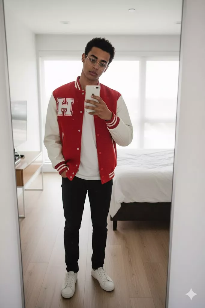 Ultra-realistic mirror selfie, full-body portrait. Use this image as the base image and perform a 100% accurate face swap using the provided reference face. Replace only the face while preserving exact outfit, pose, body, and environment: red varsity jacket with white sleeves and large “H” patch, white t-shirt, black pants, white sneakers, round glasses, smartphone covering part of the face, relaxed mirror-selfie posture, left hand in pocket, modern bedroom interior, wooden floor, soft daylight from window. Face-swap precision: exact facial structure from reference face, correct jawline, cheekbones, nose, eyes, lips, skin tone and undertone, realistic skin texture, natural pores, correct head tilt and eye direction, seamless blending at hairline, glasses edge, ears, jaw and neck, perfect lighting and shadow match. Style & quality: photorealistic DSLR look, sharp focus, natural colors, no beautification, no distortion, no artifacts, no double face, no watermark, no text. Final output must look like one real photograph with an undetectable professional face swap.