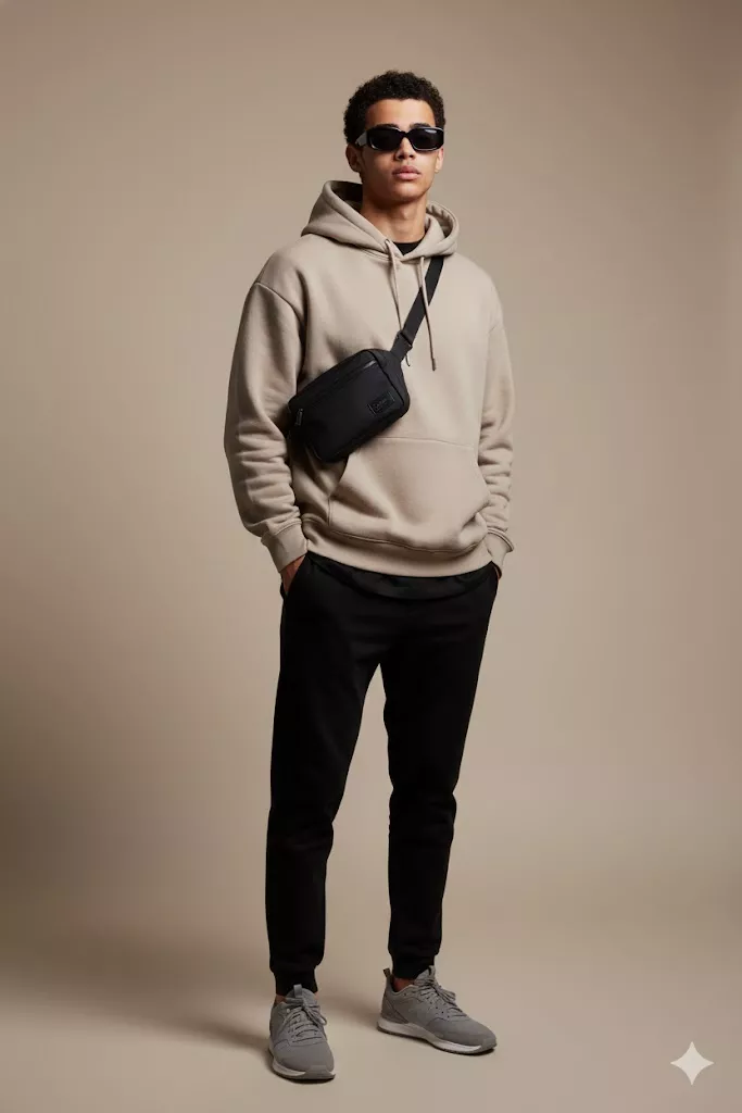 Ultra-realistic face swap full-body fashion portrait, replace the model’s face with the exact reference face, perfect facial geometry match, identical jawline, cheekbones, nose width, lip shape, eye spacing and brow position. Seamless skin tone blending, accurate undertone transfer, natural pores and micro-skin texture preserved, zero plastic skin, zero blur. Correct head size to body ratio, natural neck connection, realistic hairline merge, no halo edges, no face cutout. Subject wearing oversized grey hoodie, black jogger pants, grey sneakers, black cross-body sling bag, black sunglasses, relaxed streetwear pose, hands in pockets. Studio fashion setup, neutral beige background, soft diffused key light from front, subtle rim light for separation, realistic shadows under chin and neck. Photorealistic, DSLR quality, 85mm lens, shallow depth of field, crisp focus on face, cinematic color grading, true-to-life contrast. No artifacts, no double face, no distortion, no mismatched lighting, no warped ears, no deformed hands, no watermark, no AI look.