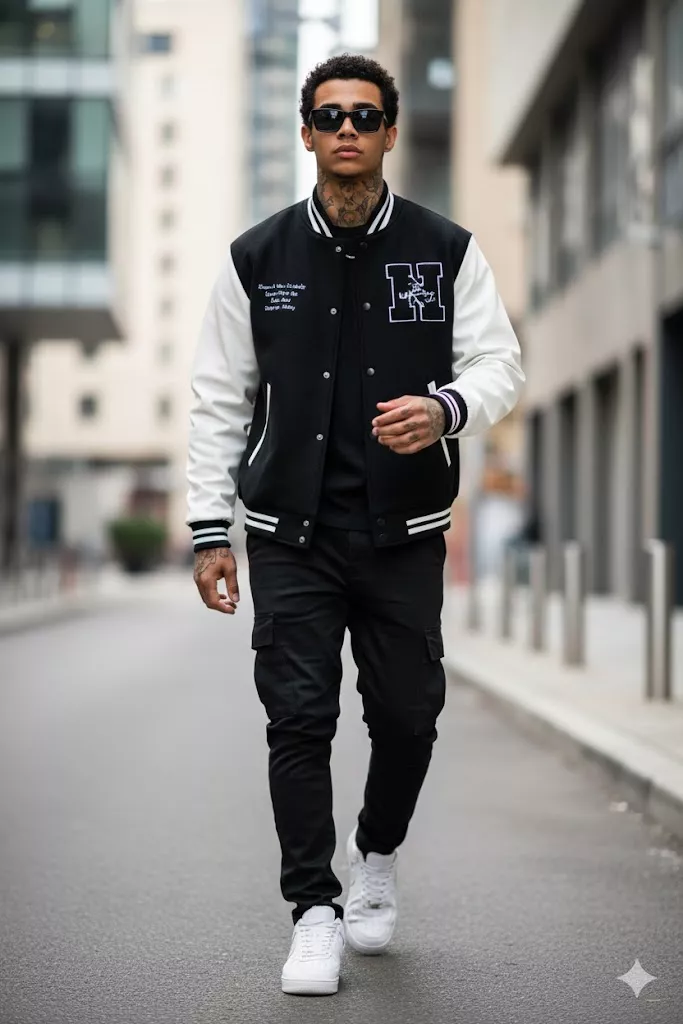 Ultra-realistic face swap portrait of a young adult male, exact facial structure and skin tone perfectly matched to the reference face, seamless identity transfer with no distortion, no mismatched lighting, no face stretching. Subject wearing black varsity jacket with white sleeves, black cargo pants, white sneakers, dark sunglasses, walking confidently on an urban street. Natural facial proportions, sharp jawline, realistic beard stubble, accurate eye shape and gaze alignment. Cinematic street photography, 85mm lens look, shallow depth of field, soft background bokeh, balanced contrast, true-to-life colors. Lighting matched to environment, realistic shadows on face and neck, skin texture preserved, pores visible, no plastic skin. High resolution, ultra-sharp details, photorealistic, professional fashion shoot quality. No artifacts, no blur, no AI face look, no double face, no deformed hands, no watermark.