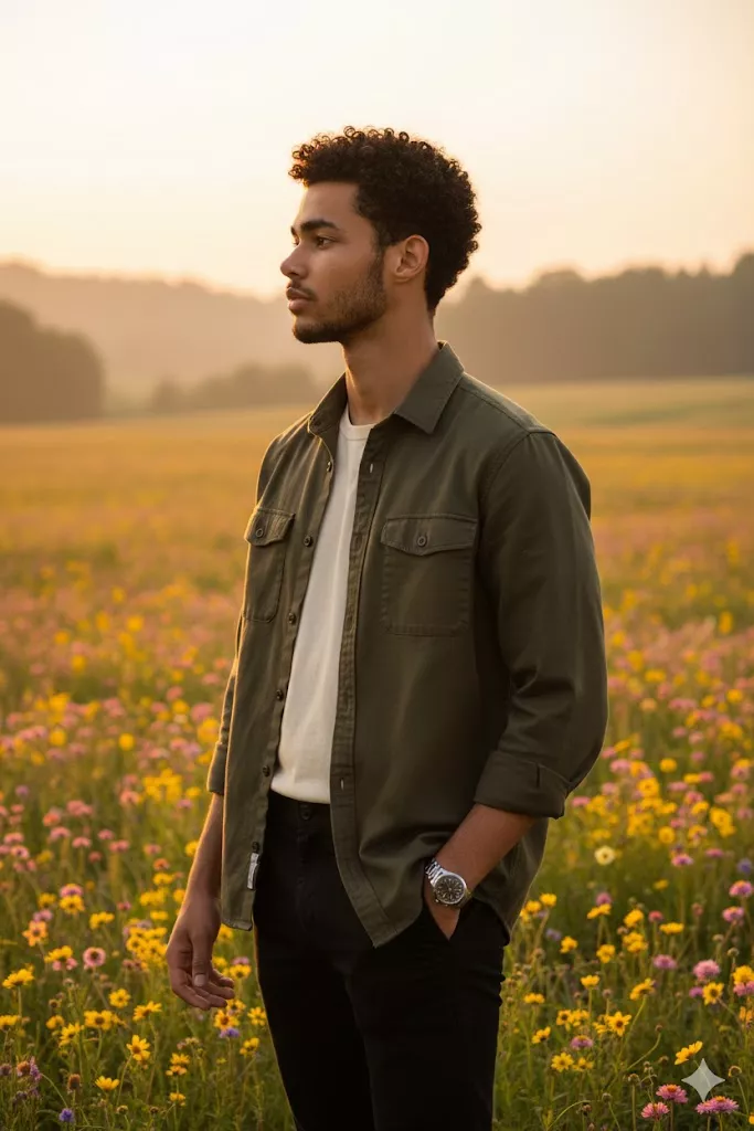 A highly detailed, photorealistic cinematic outdoor portrait of the uploaded male subject, standing alone in a wide open wildflower meadow during golden hour. The subject is positioned slightly off-center in the frame, standing upright with a relaxed posture. His body is angled in a three-quarter side profile, facing toward the horizon. One hand is placed casually inside his trouser pocket, while the other arm rests naturally by his side. His head is turned sideways, looking into the distance rather than at the camera, conveying a calm, reflective, and introspective mood. The subject is dressed in a dark olive or charcoal casual button-up overshirt, worn open over a neutral inner t-shirt. The shirt has a soft matte texture, long sleeves rolled to the forearms, and a natural, unstructured fit. He is wearing dark, slim-cut trousers with a clean silhouette. No visible logos, prints, or branding are present on the clothing. Accessories are minimal and understated, possibly including a simple wristwatch or bracelet. No hats, eyewear, or distracting elements are present, ensuring the face remains clearly visible and unobstructed for accurate facial feature extraction. Hair is short, neatly styled with natural volume. Facial hair is well-groomed, with a defined beard and mustache. Facial features are sharp and clearly defined, with even skin texture and natural detail, optimized for precise face swap alignment and identity transfer. The environment is a natural meadow filled with colorful wildflowers in shades of yellow, pink, and purple. The background includes soft rolling greenery and distant trees, partially veiled by light morning or evening mist. The sun is low on the horizon, casting warm golden light across the scene. Lighting is natural and directional, coming from the side and slightly behind the subject, creating a subtle rim light around the hair and shoulders. Shadows are soft and cinematic, with high dynamic range, warm highlights, and gentle contrast that preserves facial depth without harsh edges. Captured using a professional full-frame camera with a portrait lens in the 50mm–85mm range. Shallow to moderate depth of field creates a creamy background blur, isolating the subject sharply against the soft, dreamy environment. Color grading is cinematic with warm highlights, natural skin tones, and rich but balanced saturation. Optimized for high-precision face swap, accurate facial landmark detection, seamless lighting and color transfer, and full preservation of pose, outfit, environment, and cinematic realism.