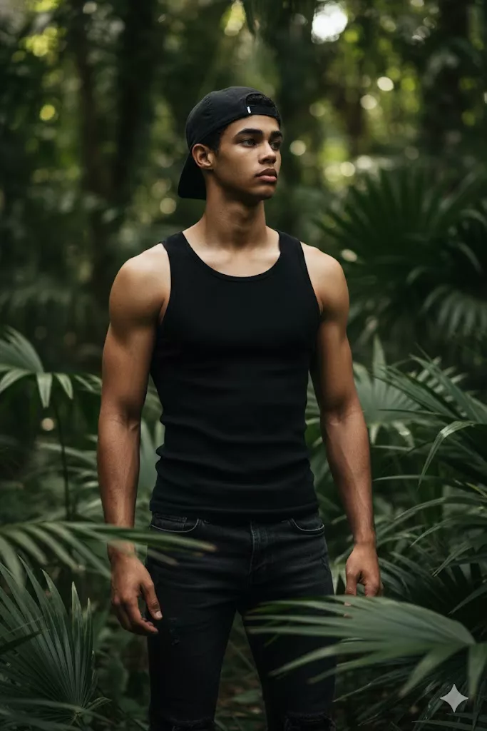 A highly detailed, photorealistic outdoor portrait of the uploaded male subject, standing partially concealed within dense tropical foliage. The subject is positioned upright with a strong, grounded stance, shoulders squared and torso facing slightly off-center. His head is turned to the side, and he is looking intently into the distance, away from the camera, conveying a focused, alert, and masculine expression. The subject is wearing a fitted black sleeveless tank top that closely follows the muscular contours of the upper body, highlighting defined shoulders, arms, and chest. He is paired with dark, slightly worn denim jeans with a natural matte texture. A dark baseball cap is worn low on the head, casting a subtle shadow across the upper face. No visible logos or distracting branding dominate the clothing. His physique is athletic and muscular, with clearly defined arms and forearms. Skin texture is realistic with natural pores, subtle veins, and light body hair visible on the arms. Facial features are sharp and well-defined, with short facial stubble adding rugged character. Facial structure, proportions, and skin detail are preserved clearly to ensure high-accuracy face swap compatibility. The environment is a lush jungle or dense forest setting, filled with large green leaves in the foreground and background. Leaves partially overlap the subject, creating depth and a layered composition. The background is softly blurred while still retaining identifiable foliage shapes, enhancing subject separation. Lighting is natural and cinematic, filtered through leaves above. Soft directional sunlight creates highlights along the arms, shoulders, and face, while shadows form organically between leaves and across the body. The color palette is rich and earthy, dominated by deep greens, muted browns, and natural skin tones. Captured using a professional full-frame camera with a portrait lens in the 50mm–85mm range. Shallow depth of field isolates the subject while maintaining environmental context. High dynamic range, balanced contrast, sharp focus on facial features, and realistic color grading are applied. Optimized for precise face swap output, accurate facial landmark retention, realistic lighting transfer, natural skin blending, and faithful replication of pose, outfit, environment, and mood.