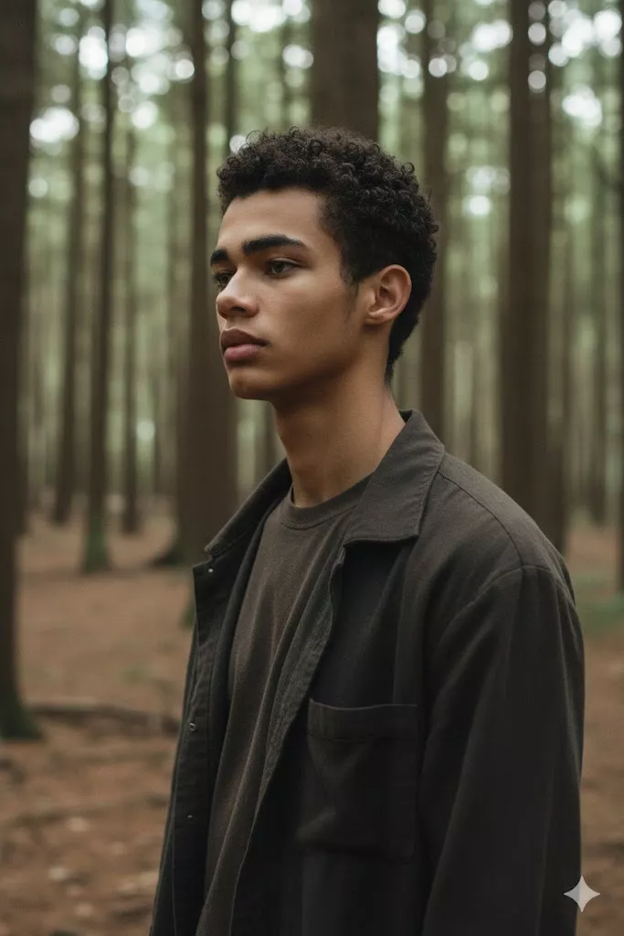 A highly detailed, photorealistic outdoor portrait of the uploaded male subject, captured in a quiet forest environment. The subject is standing upright in a relaxed posture, positioned slightly off-center in the frame. His body is angled in a three-quarter side profile, facing toward the left side of the frame. His head is slightly raised, and he is looking forward into the distance with a calm, thoughtful, and introspective expression. He is not looking at the camera. The subject is wearing a dark, earthy-toned casual jacket with a structured but natural fit, layered over a high-neck or crew-neck inner top in a neutral shade. The clothing has a matte, natural fabric texture with no visible logos, prints, or branding. The outfit blends harmoniously with the forest environment and maintains a clean, minimal aesthetic. No visible accessories are present. Hair is short, neatly trimmed, and naturally styled. Facial features are clearly visible in profile, with even skin texture and sharp contours, suitable for accurate facial feature extraction and high-quality face swap alignment. The environment is a dense forest setting with tall trees and natural foliage. Soft green leaves partially frame the foreground, creating depth and a layered composition. The background is softly blurred with visible tree trunks and branches, contributing to a tranquil, cinematic atmosphere. Lighting is natural and diffused, filtering through the tree canopy. Soft daylight illuminates the subject’s face from the side, creating gentle highlights and smooth shadows. Contrast is moderate, preserving facial detail without harsh lighting or blown highlights. Captured using a professional full-frame camera with a portrait lens in the 50mm–85mm range. Shallow depth of field isolates the subject while maintaining environmental context. Color grading is natural and subdued, emphasizing earthy greens, neutral skin tones, and a realistic cinematic look. Optimized for precise face swap accuracy, clean facial landmark detection, consistent lighting transfer, and full preservation of pose, outfit, environment, and realistic depth.