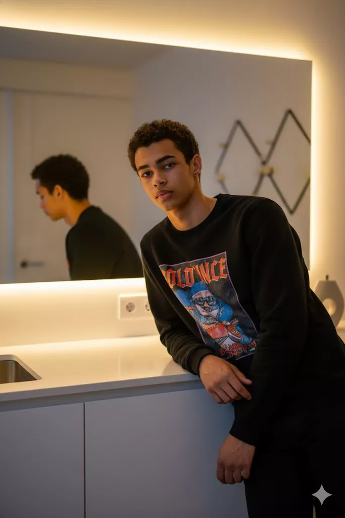Young man indoors leaning on counter, modern graphic sweatshirt, curly hair, soft warm LED mirror lighting, clean minimalist room, confident relaxed expression, cinematic portrait, shallow depth of field, high detail.