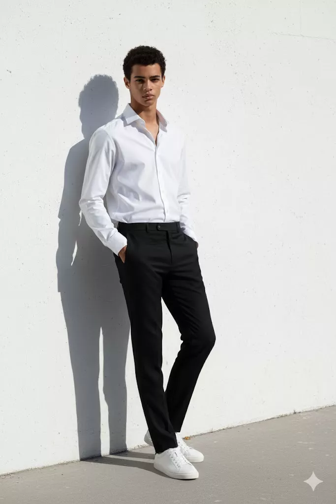 Minimal fashion portrait of a young man leaning against a white wall, crisp white shirt, black tailored pants, casual sneakers, hands in pockets, soft natural sunlight creating strong shadows, clean aesthetic, calm mood, high-quality lifestyle photography.