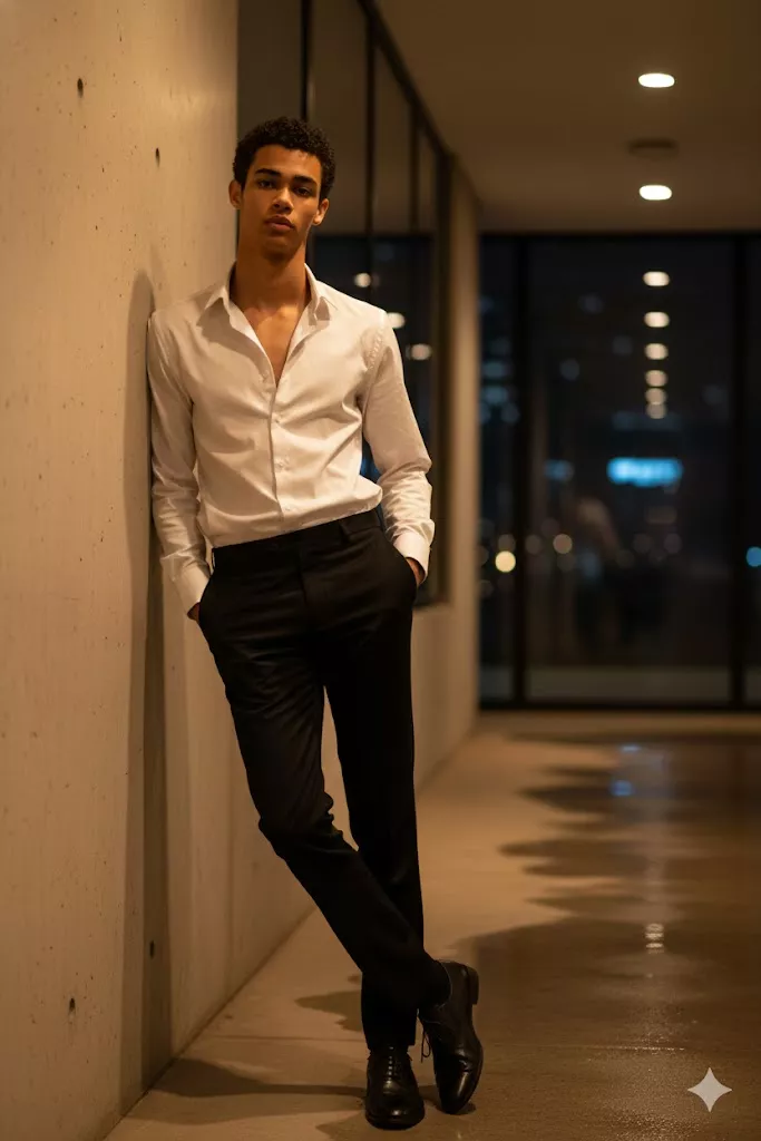 Stylish night portrait of a young man leaning against a wall, white button-down shirt slightly open, black trousers, black formal shoes, relaxed confident pose, indoor-outdoor corridor setting, warm ambient lighting, clean architectural background, shallow depth of field, cinematic realistic photography.