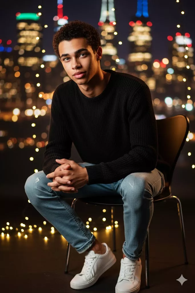 Studio-style night portrait of a young man sitting on a modern chair, black sweater, light blue jeans, white sneakers, hands clasped, confident calm expression, city skyline bokeh lights in background, warm fairy lights, shallow depth of field, sharp focus on face, cinematic lighting, ultra realistic photography.