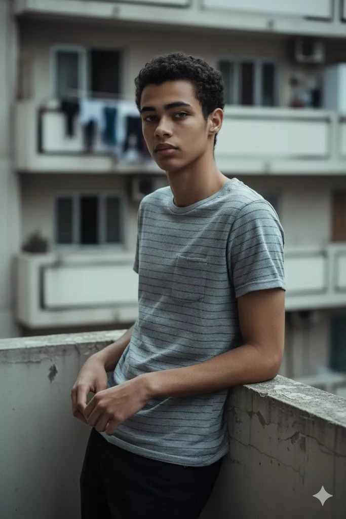 Moody urban portrait of a young man leaning on a balcony railing, grey striped shirt, black trousers, soft overcast daylight, apartment building background with hanging laundry, shallow depth of field, cinematic street photography, realistic skin texture, subdued color palette.