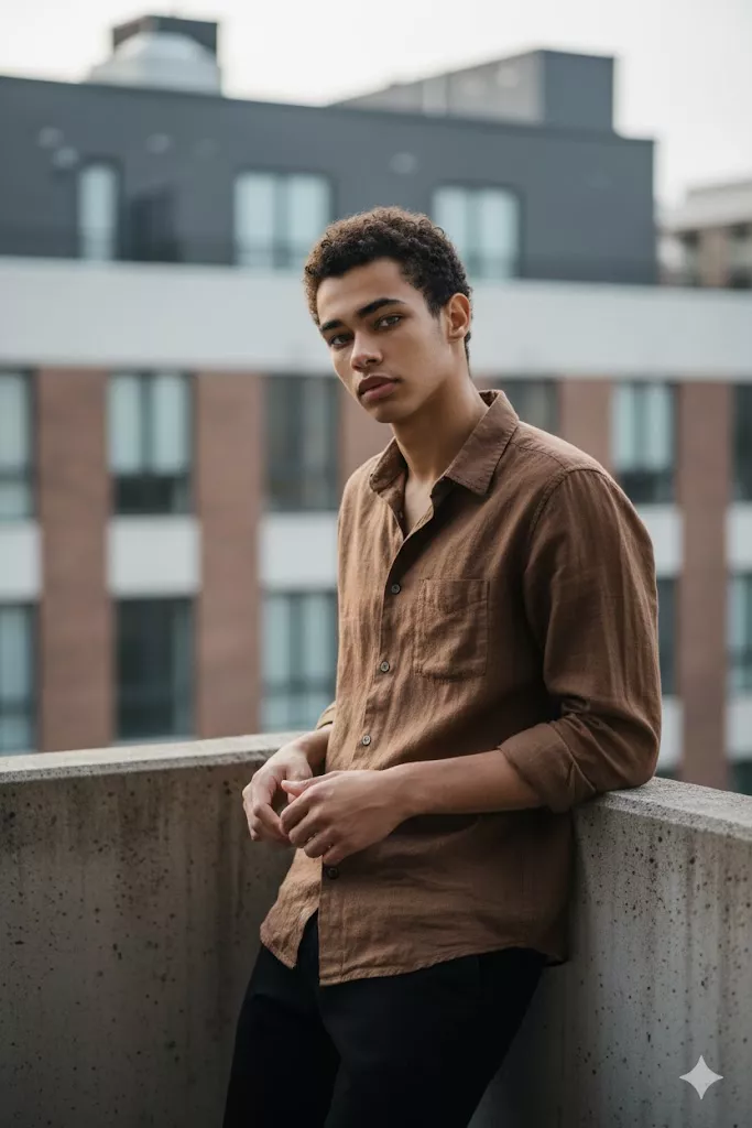 Cinematic urban portrait of a young man leaning on a balcony, wearing a brown textured shirt with rolled sleeves and black trousers. Soft daylight, shallow depth of field, apartment building background, natural skin texture, moody realistic tone, casual street photography style.