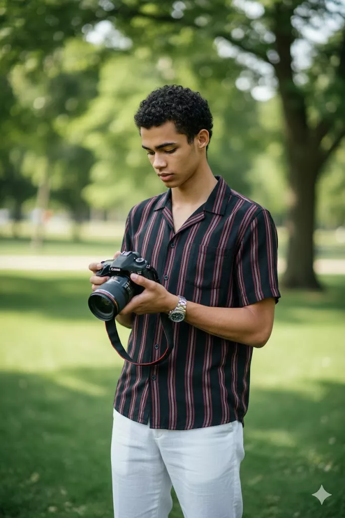 Young man outdoor portrait, holding DSLR camera, black and maroon striped shirt, white pants, natural green background, soft daylight, shallow depth of field, candid pose, cinematic photography.