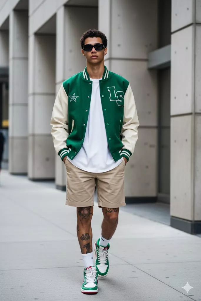 Street style male fashion portrait, urban concrete background, green varsity jacket with cream sleeves and star details, oversized white t-shirt, beige shorts, tattooed legs, white crew socks, green red sneakers, sunglasses, walking candid pose, modern streetwear photography, soft natural daylight, shallow depth of field.