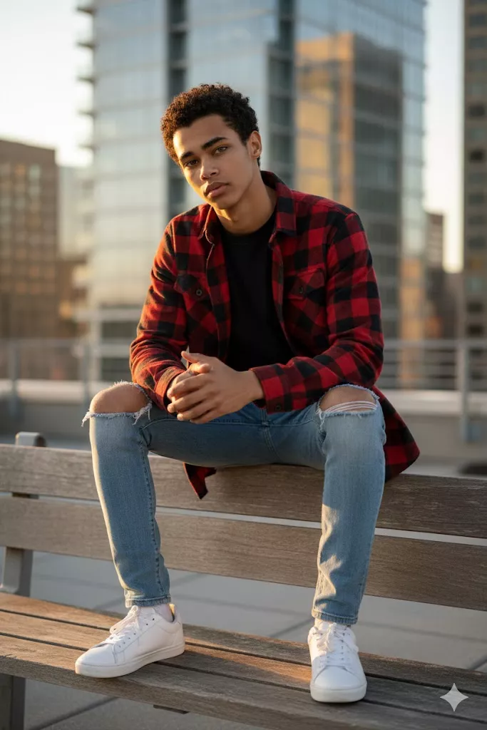Young man casual portrait, outdoor urban rooftop, red plaid flannel over black t-shirt, light blue ripped jeans, white sneakers, seated relaxed pose, soft golden hour sunlight, shallow depth of field, modern cinematic photography, natural colors.