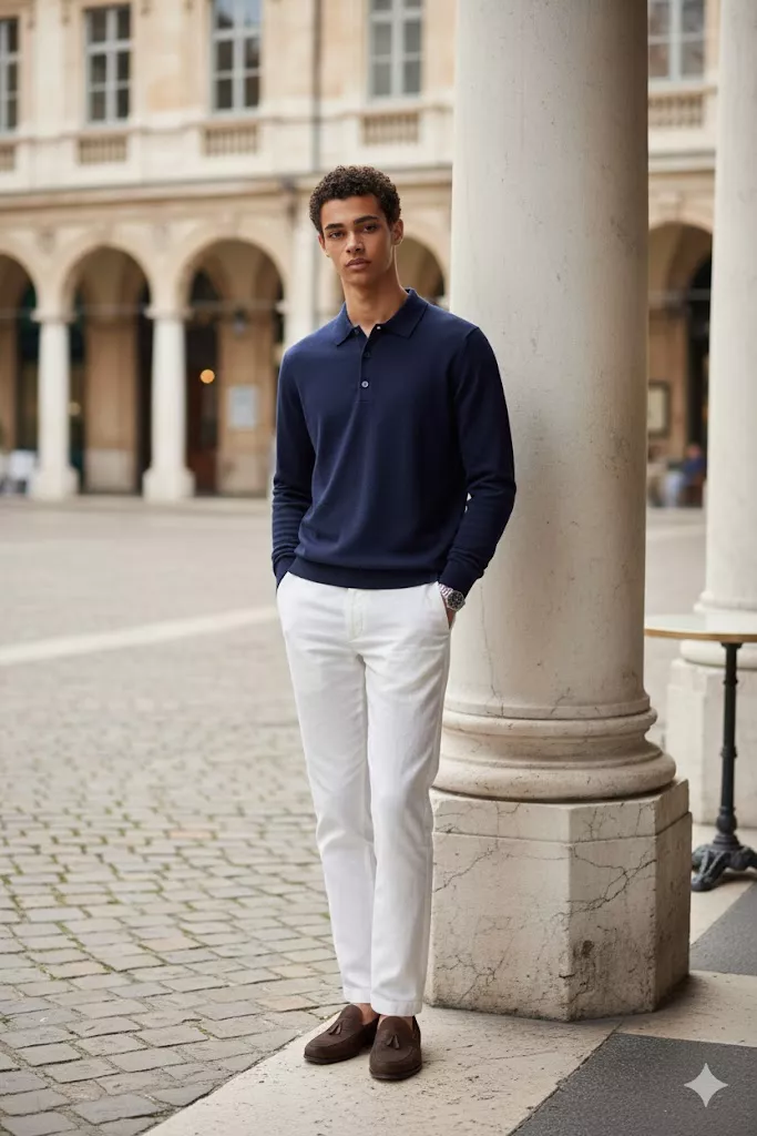 Young man fashion portrait, curly hair, navy knit polo sweater, white trousers, silver wristwatch, calm confident pose, classic European architecture background, soft natural daylight, shallow depth of field, clean minimal aesthetic, realistic photography.