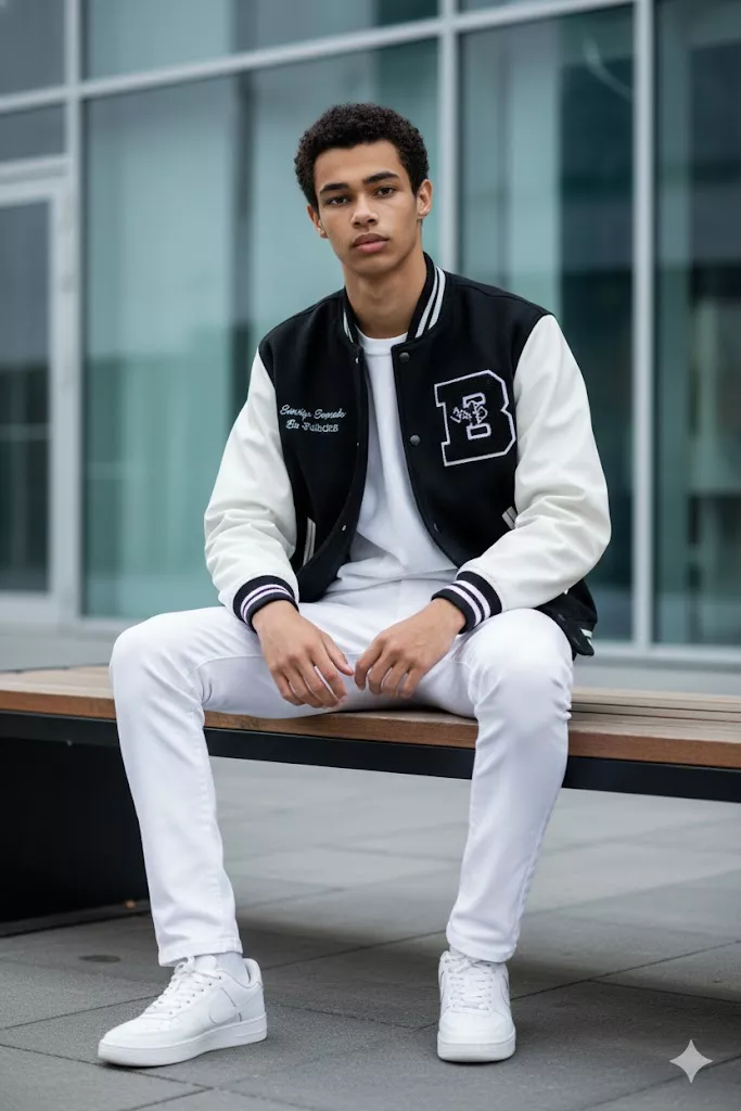 Modern urban fashion portrait, young man sitting on wooden bench, black and white varsity jacket, white pants and sneakers, casual confident pose, contemporary glass building background, soft overcast daylight, shallow depth of field, clean realistic photography.
