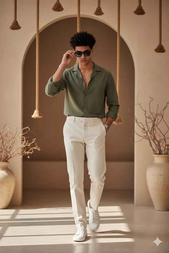 A highly detailed, photorealistic indoor lifestyle fashion portrait of the uploaded male subject, captured mid-walk inside a minimalist, aesthetic interior space. His body is facing forward, with one leg stepping ahead naturally, creating a smooth walking motion. His posture is relaxed yet confident. One hand is placed casually inside the trouser pocket, while the other hand is raised near the face, lightly adjusting his sunglasses. His head is slightly tilted downward, and he is looking forward with a calm, composed, and stylish expression. The subject is dressed in a refined casual outfit. He is wearing a muted olive-green long-sleeve shirt with a relaxed fit, featuring an open collar and a deep V-shaped neckline with no visible buttons fastened. The fabric appears soft, lightweight, and slightly textured. The shirt is paired with off-white or cream straight-cut trousers with a clean, tailored silhouette. On his feet, he is wearing minimalist white low-top sneakers with a smooth finish and subtle detailing. Accessories include dark rectangular sunglasses with a slim frame, a metallic wristwatch worn on one wrist, and a thin bracelet on the opposite wrist. No visible logos or branding are present on the clothing or accessories. His hair is dark, medium length, and styled with natural volume and soft curls, neatly shaped around the head. Facial hair is clean-shaven or very lightly stubbled. Skin texture appears natural, evenly lit, and realistic, optimized for precise and clean face-swap alignment. The environment is a warm, minimalist interior with a soft beige and cream color palette. Architectural elements include a large rounded archway framing the subject. Decorative rope installations hang symmetrically from the ceiling, and large neutral-toned ceramic vases with dried branches are placed in the background. The floor is light wood, adding warmth to the scene. The background is clean, uncluttered, and aesthetically balanced. Lighting is natural and diffused, entering from one side of the space, creating soft highlights on the face and clothing with gentle shadows on the floor and walls. The overall lighting is bright, airy, and evenly distributed, enhancing realism and depth. Captured in a professional studio-lifestyle environment using a full-frame DSLR or mirrorless camera with a portrait lens (approximately 50mm to 85mm), sharp subject focus, shallow depth of field, high clarity, controlled contrast, neutral color grading, and modern editorial fashion-photography composition optimized for highly accurate and realistic face-swap results.