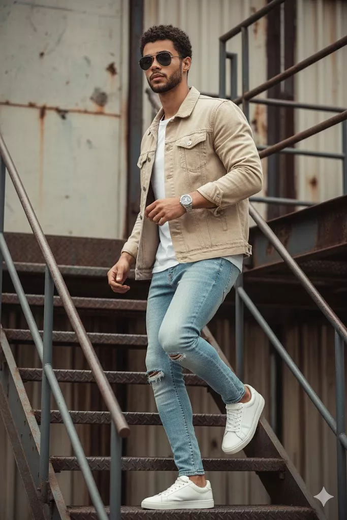 A highly detailed, photorealistic outdoor fashion portrait of the uploaded male subject, captured mid-step while descending an industrial metal staircase. His body is angled slightly to the side, with one foot placed lower on the step and the other trailing behind, creating a strong dynamic walking pose. His posture is confident and masculine. One hand is relaxed near the thigh, while the other arm is bent naturally as he moves. His head is turned slightly to the side, looking off-camera with a sharp, composed, and self-assured expression. The subject is wearing a casual rugged outfit. He is dressed in a light beige denim-style jacket with visible seams, metal buttons, and chest flap pockets, worn open over a clean white crew-neck t-shirt. The jacket fabric appears structured yet worn-in, adding texture. He is paired with light blue slim-fit jeans featuring distressed rips at the knee area. On his feet, he is wearing clean white low-top sneakers with a smooth leather finish and minimal detailing. Accessories include dark aviator-style sunglasses with reflective lenses and a metallic wristwatch worn on one wrist. No visible logos or branding are present. His hair is dark, neatly styled with volume and a clean fade on the sides. Facial hair is a well-groomed short beard, adding definition to the jawline. Skin texture is realistic and evenly lit, optimized for accurate and clean face-swap alignment. The environment is an industrial outdoor setting with weathered metal walls, exposed steel structures, and rusted railings. The staircase and background elements create strong leading lines and depth. The color palette is neutral and earthy, dominated by beige, steel gray, and muted rust tones. Lighting is natural daylight, coming from the side and slightly above, casting soft shadows and highlighting facial contours, clothing textures, and metallic surfaces. The lighting is balanced, with high realism and clear separation between subject and background. Captured in a professional lifestyle-fashion setup using a full-frame DSLR or mirrorless camera with a portrait lens (approximately 50mm to 85mm), sharp subject focus, shallow depth of field, high clarity, controlled contrast, cinematic color grading, and modern editorial composition optimized for highly accurate and realistic face-swap results.