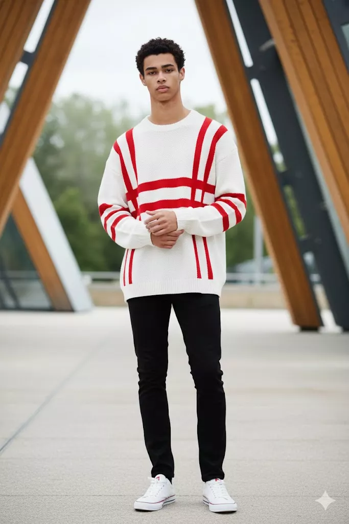 A highly detailed, photorealistic full-body fashion portrait of the uploaded male subject, standing upright in an outdoor modern architectural space. The subject is centered in the frame, facing directly toward the camera with a balanced, symmetrical stance. Both feet are placed flat on the ground, shoulder-width apart. His hands are gently clasped together at waist level, creating a calm and composed posture suitable for precise facial alignment. The subject is wearing a white oversized knit sweater featuring bold red geometric stripe patterns across the chest, shoulders, and sleeves. The fabric appears soft, thick, and matte, with clear knit texture and clean edges. The sweater fits relaxed but structured, with no visible logos or branding. He is paired with slim-fit black trousers that fall cleanly to the ankles, maintaining straight vertical lines for full-body proportion accuracy. On his feet, the subject is wearing white low-top sneakers with minimal red accent details, clean soles, and a modern casual design. No visible dirt or wear is present, ensuring a polished fashion look. Accessories are minimal to avoid facial obstruction. No eyewear is present. No hats or head coverings. No distracting jewelry. The face is fully visible, unobstructed, and evenly lit for optimal face swap precision. Hair is medium-length, dark, and naturally wavy, styled with volume and swept slightly to one side. Facial hair is neatly groomed with a short beard and defined jawline. Facial expression is neutral and relaxed, lips closed, eyes open and looking straight at the camera. Facial features are sharp, symmetrical, and clearly defined, optimized for high-fidelity face replacement. The environment is a contemporary outdoor setting with large angled wooden and metal structural elements forming diagonal lines behind the subject. Soft greenery and trees are visible in the background. The background is moderately blurred to separate the subject while preserving realistic depth and context. Lighting is natural daylight, evenly diffused, with soft highlights on the face and clothing. No harsh shadows or overexposed areas. Skin tones appear natural and balanced, with accurate color reproduction. Captured in a professional photography setup using a full-frame camera with a portrait lens in the 50mm–85mm range. The image features sharp facial focus, high resolution, realistic skin texture, controlled contrast, neutral color grading, and editorial-quality composition. Optimized specifically for maximum face-swap accuracy, identity consistency, realistic facial mapping, and seamless integration of a replacement face while preserving original pose, lighting, proportions, and clothing details.