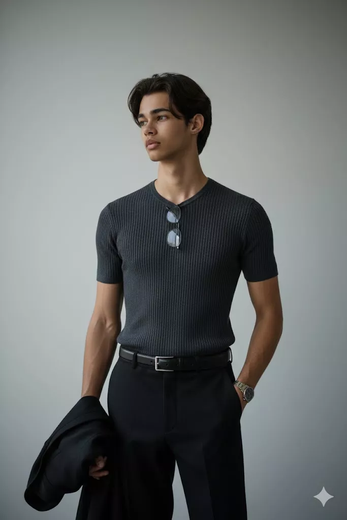 A highly detailed, photorealistic indoor fashion portrait of the uploaded male subject, standing upright near a plain light-gray wall in a minimalist interior space. The subject’s body is angled slightly to the left, while his head is turned further to the left, looking off-frame with a calm, thoughtful expression. His posture is relaxed yet confident, emphasizing clean body lines for accurate proportion mapping. The subject is wearing a fitted, dark charcoal ribbed short-sleeve knit T-shirt that closely follows the upper body, highlighting the shoulders, arms, and chest. The fabric appears fine-gauge, matte, and evenly textured with vertical ribbing. A pair of black tailored trousers sits at the waist, secured with a black leather belt featuring a subtle metallic buckle. The trousers are clean-cut, straight-fit, and wrinkle-free. In his left hand, the subject is holding a black jacket casually draped downward, while his right hand is placed inside the trouser pocket, reinforcing a relaxed editorial pose. A metallic wristwatch is worn on the right wrist, adding a minimal accessory detail without distracting from the face. No eyewear is worn on the face. A pair of glasses is hanging from the collar of the T-shirt, positioned centrally on the chest and not obstructing facial features. No hats or head coverings are present. Hair is short to medium length, dark, and naturally styled with soft volume and a clean side profile. Facial hair is minimal or clean-shaven, with a smooth jawline and clearly defined facial contours. The facial expression is neutral, lips closed, eyes naturally open, and facial features remain fully visible and unobstructed, optimized for precise face swap alignment and identity transfer. Lighting is soft, natural, and directional, entering from one side to create gentle shadows along the jawline and neck while maintaining even illumination across the face. Skin tones appear natural and balanced, with realistic texture and no harsh highlights or blown areas. The background is intentionally minimal, consisting of a plain wall and subtle corner geometry, ensuring zero distractions and maximum subject isolation. Depth of field is moderate, keeping the entire subject sharp while maintaining a clean editorial look. Captured in a professional indoor setting using a full-frame camera with a portrait lens in the 50mm–85mm range. The image features high resolution, sharp facial focus, accurate color grading, controlled contrast, realistic skin detail, and modern fashion-editorial composition. Specifically optimized for 100 percent face swap accuracy, clean facial geometry extraction, lighting consistency, and seamless integration of a replacement face while preserving original pose, clothing, shadows, and proportions.