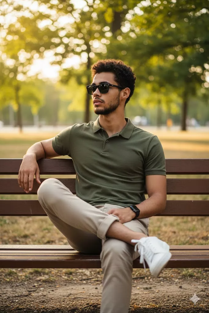 A highly detailed, photorealistic outdoor lifestyle portrait of the uploaded male subject, seated casually on a wooden park bench in a natural park environment. The subject is positioned centrally on the bench, with his torso facing slightly forward and his head turned subtly to the left, looking off-frame with a calm, confident, and composed expression. His posture is relaxed, conveying effortless masculinity and balance. The subject is wearing an olive-green fitted polo shirt with a classic collar and short sleeves, tailored closely to the upper body and arms. The fabric appears smooth, matte, and breathable, with no visible logos or patterns. He is paired with beige slim-fit chinos, neatly tailored and wrinkle-free, rolled slightly above the ankles. On his feet, he is wearing clean white low-top sneakers with a minimalist design. One arm is resting comfortably along the backrest of the wooden bench, while the other arm rests naturally near his lap. His legs are crossed casually at the knee, creating a relaxed seated pose that maintains clear body proportions. A dark smartwatch is worn on one wrist, adding a subtle modern accessory detail without distracting from the face. The subject is wearing dark sunglasses with a classic rectangular frame, fully covering the eyes. Facial hair is neatly groomed, featuring a short, well-defined beard and mustache. Hair is thick, dark, and styled with volume, brushed upward and back, maintaining a clean silhouette. Facial structure, jawline, and skin texture remain clearly visible and well-defined for accurate facial mapping. Lighting is natural and warm, consistent with late afternoon or golden-hour conditions. Soft sunlight filters through surrounding trees, creating an even, flattering illumination across the face and body. Gentle shadows fall naturally, preserving depth without harsh contrast. Skin tones appear realistic, warm, and balanced. The background consists of tall trees with green foliage, softly blurred to create a shallow depth of field. Fallen leaves and natural ground textures are visible near the bench, reinforcing an authentic outdoor park setting. The background remains unobtrusive, ensuring strong subject separation and focus. Captured using a professional full-frame camera with a portrait lens in the 50mm–85mm range. The image features sharp subject focus, moderate background blur, natural color grading, controlled contrast, and a modern lifestyle-photography aesthetic. Optimized for high-fidelity face swap accuracy, consistent outdoor lighting adaptation, clean facial geometry extraction, and seamless identity replacement while preserving pose, clothing, shadows, and environmental realism.