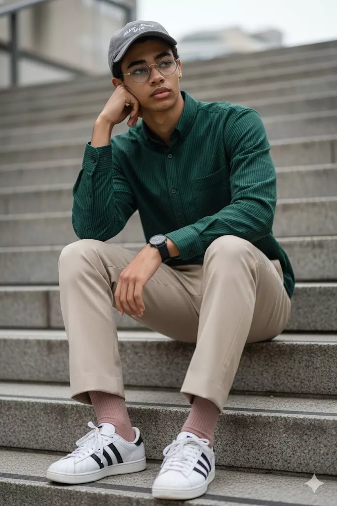 A highly detailed, photorealistic casual street-style portrait of the uploaded male subject, seated on a concrete staircase in an outdoor urban environment. The subject is positioned centrally on the steps, sitting low with knees bent and feet flat on a lower step, creating a relaxed, grounded pose. His torso leans slightly forward, and his head is tilted gently to one side. One elbow rests on his knee, with his cheek supported by his hand, conveying a calm, introspective, and thoughtful mood. His gaze is directed slightly off-camera with a neutral, relaxed expression. The subject is wearing a deep green button-up shirt with thin vertical pinstripes. The shirt has a classic collar, long sleeves rolled casually to the wrists, and a soft, matte fabric texture with no visible logos or graphics. It is worn loosely for a natural, effortless silhouette. He is paired with beige straight-cut trousers, clean and minimally tailored, with a slight break at the ankle. On his feet, he is wearing white low-top sneakers with black side stripes, clean and lightly worn, paired with muted pink or dusty-rose socks that are visible above the shoes. Accessories include a grey baseball cap with subtle embroidered text on the front, round metal-frame eyeglasses with clear lenses, and a dark wristwatch worn on one wrist. Hair is mostly concealed by the cap, with minimal strands visible at the sides. Facial features are soft and youthful, with smooth skin texture and minimal facial hair. The face is clearly visible, evenly lit, and unobstructed, optimized for precise facial landmark detection and face swap accuracy. Lighting is soft and diffused, consistent with an overcast outdoor setting or shaded urban area. Shadows are gentle and natural, preserving facial depth without harsh contrast. Skin tones appear balanced and realistic. The background consists of concrete steps and subtle architectural elements, slightly blurred to maintain subject focus. The environment feels authentic and understated, with neutral tones that do not distract from the subject. CapturedA highly detailed, photorealistic casual street-style portrait of the uploaded male subject, seated on a concrete staircase in an outdoor urban environment. The subject is positioned centrally on the steps, sitting low with knees bent and feet flat on a lower step, creating a relaxed, grounded pose. His torso leans slightly forward, and his head is tilted gently to one side. One elbow rests on his knee, with his cheek supported by his hand, conveying a calm, introspective, and thoughtful mood. His gaze is directed slightly off-camera with a neutral, relaxed expression. The subject is wearing a deep green button-up shirt with thin vertical pinstripes. The shirt has a classic collar, long sleeves rolled casually to the wrists, and a soft, matte fabric texture with no visible logos or graphics. It is worn loosely for a natural, effortless silhouette. He is paired with beige straight-cut trousers, clean and minimally tailored, with a slight break at the ankle. On his feet, he is wearing white low-top sneakers with black side stripes, clean and lightly worn, paired with muted pink or dusty-rose socks that are visible above the shoes. Accessories include a grey baseball cap with subtle embroidered text on the front, round metal-frame eyeglasses with clear lenses, and a dark wristwatch worn on one wrist. Hair is mostly concealed by the cap, with minimal strands visible at the sides. Facial features are soft and youthful, with smooth skin texture and minimal facial hair. The face is clearly visible, evenly lit, and unobstructed, optimized for precise facial landmark detection and face swap accuracy. Lighting is soft and diffused, consistent with an overcast outdoor setting or shaded urban area. Shadows are gentle and natural, preserving facial depth without harsh contrast. Skin tones appear balanced and realistic. The background consists of concrete steps and subtle architectural elements, slightly blurred to maintain subject focus. The environment feels authentic and understated, with neutral tones that do not distract from the subject. Captured using a professional full-frame camera with a portrait lens in the 50mm–85mm range. The image features sharp focus on the subject, moderate depth of field, natural color grading, controlled contrast, and a modern street-photography aesthetic. Optimized for high-accuracy face swap, clean facial geometry extraction, consistent lighting transfer, and seamless identity replacement while preserving pose, outfit, textures, and environmental realism. using a professional full-frame camera with a portrait lens in the 50mm–85mm range. The image features sharp focus on the subject, moderate depth of field, natural color grading, controlled contrast, and a modern street-photography aesthetic. Optimized for high-accuracy face swap, clean facial geometry extraction, consistent lighting transfer, and seamless identity replacement while preserving pose, outfit, textures, and environmental realism.